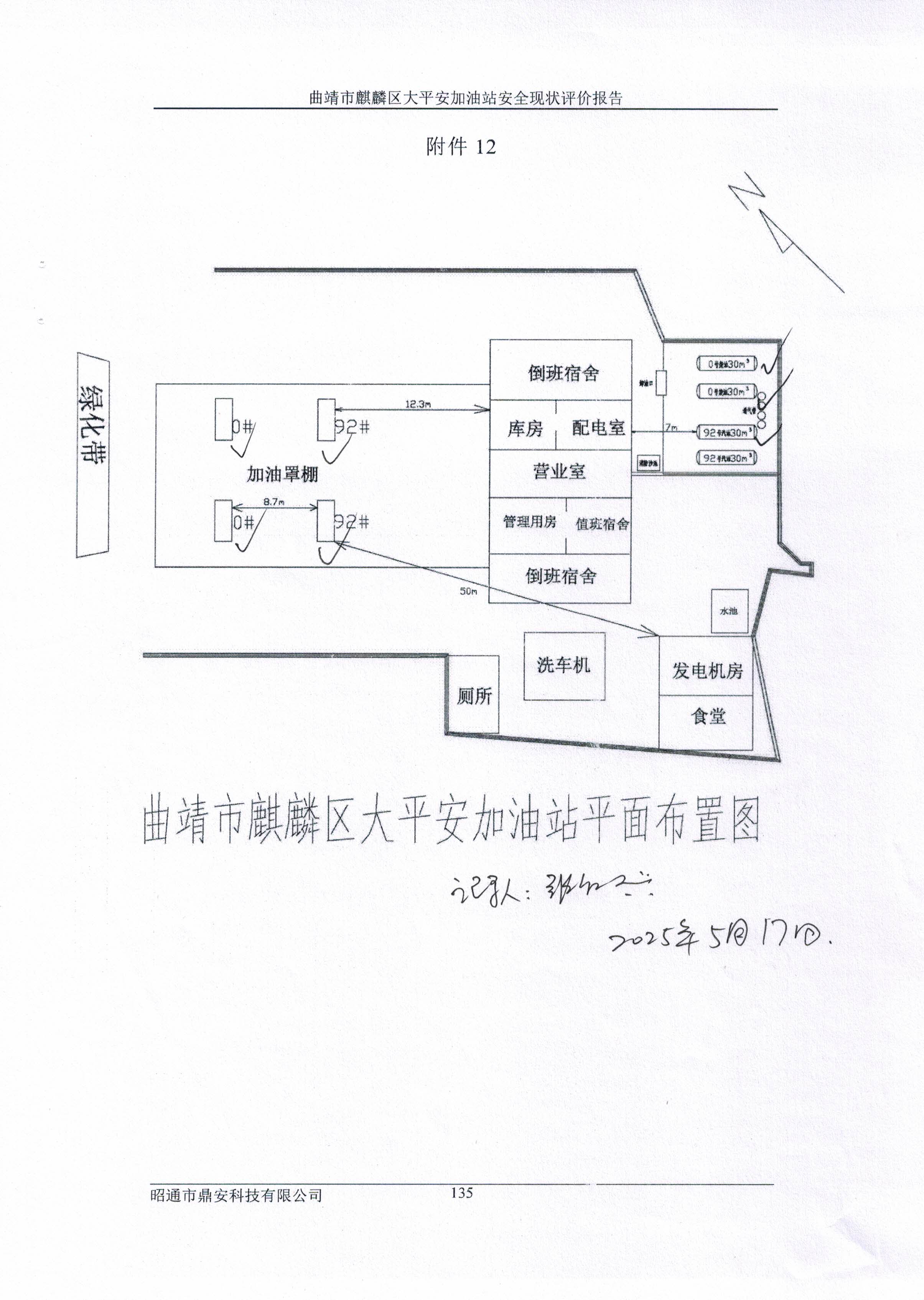 評價結論為:曲靖市麒麟?yún)^(qū)大平安加油站已完成本次評價發(fā)現(xiàn)的不符合項整改,站址選擇及平面布置、加油工藝及設施、消防設施、電氣及報警系統(tǒng)、建(構)筑物等方面符合《汽車加油加氣加氫站技術標準》(GB50156-2021)、《加油站作業(yè)安全規(guī)范》(AQ3010-2022)標準規(guī)定;經(jīng)營場所、危險化學品儲存設施、人員配置及培訓考核、安全管理制度、安全操作規(guī)程、應急預案、應急物資滿足《危險化學品安全管理條例》(國務院令第591號,第645號修改)第三十四條、《危險化學品經(jīng)營許可證管理辦法》(原國家安監(jiān)總局令第55號公布,第79號修正)第六條要求,從安全的角度曲靖市麒麟?yún)^(qū)大平安加油站具備危險化學品經(jīng)營的安全條件。 | ||||||||