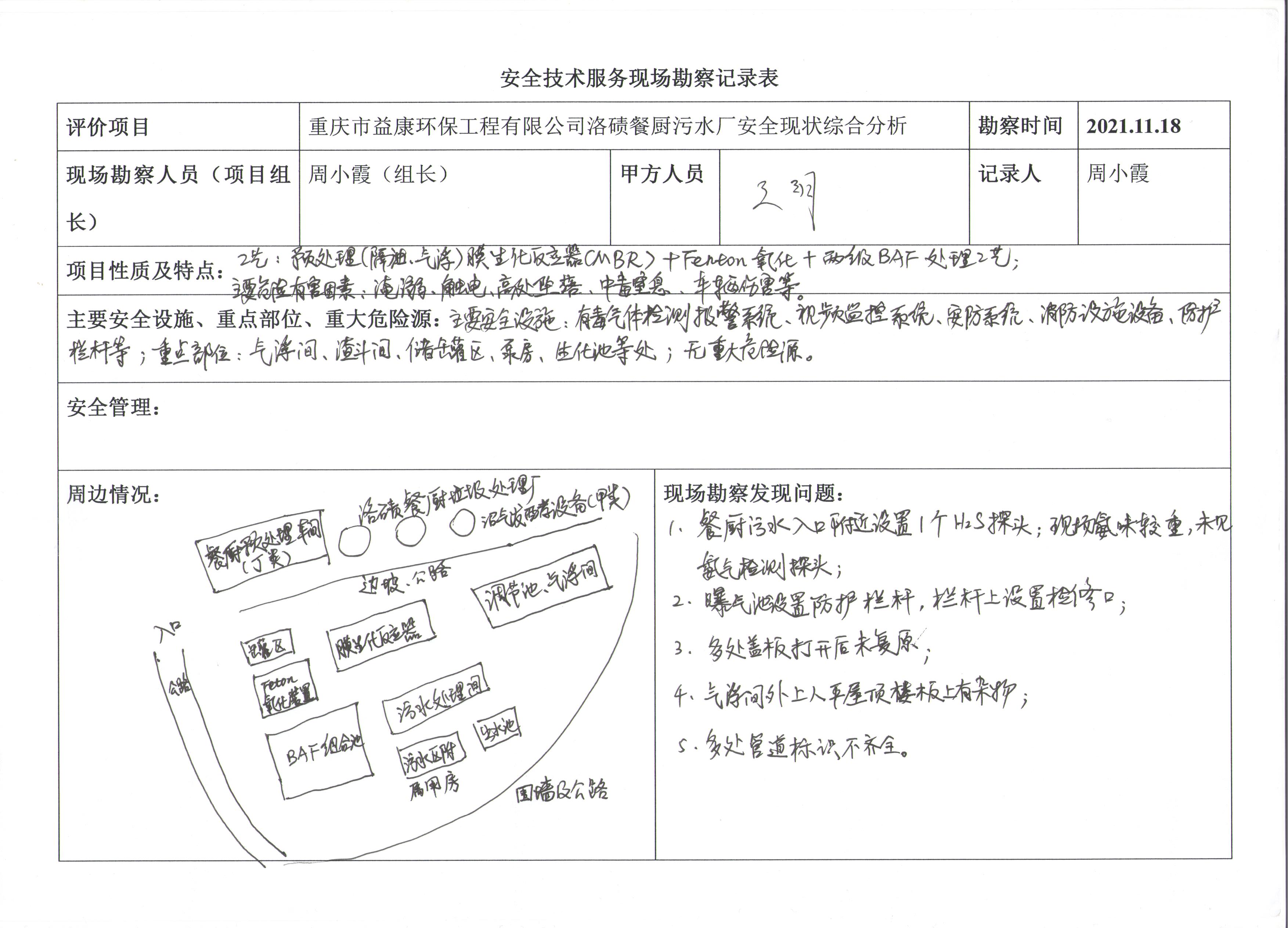 現(xiàn)場(chǎng)勘查情況 | 重慶市益康環(huán)保工程有限公司洛磧餐廚污水廠(chǎng)安全狀情況 | |||||||