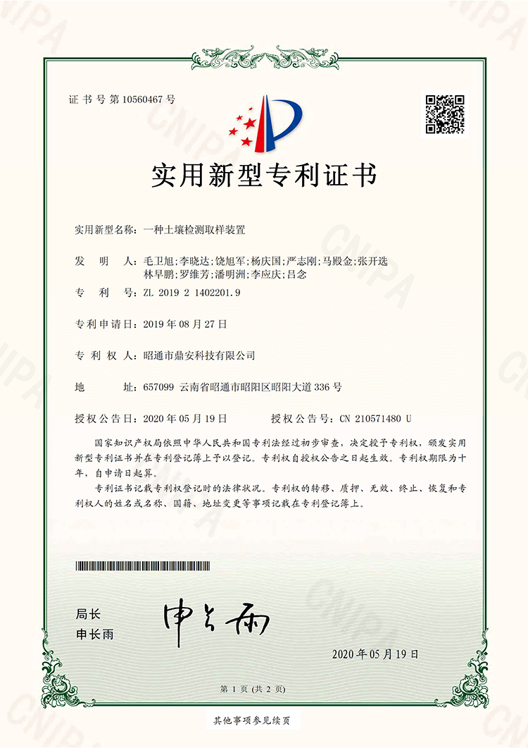 10560467一種土壤檢測取樣裝置20200519實用新型專利證書